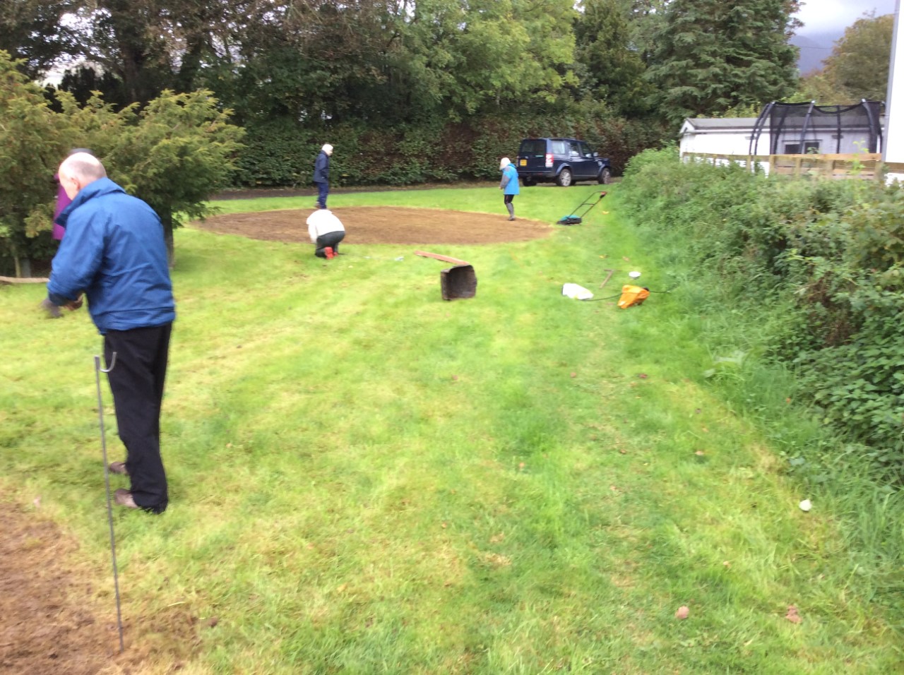 The hardy group of volunteers moved from the Church to work on the partially prepared ‘muddy discs’ of land at Crossgates. The group appreciated the aid of an electric scarifier and a long extension electric lead used to tap into the electricity supply in an adjacent property.